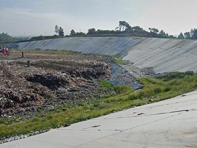 固體廢棄物垃圾填埋一般是利用山坳、開挖過的礦山等進行填埋防滲。填埋場的防滲層上面都是要填埋成千上萬噸的垃圾,所以一般采用1.5mm以上厚度的防滲膜,幅寬也應大于6米,減少焊接縫。因為實踐證明,填埋場的滲漏70%出現(xiàn)在焊接縫。坡面可采用糙面土工膜,增加摩擦系數(shù),使可用容積達到大化。
