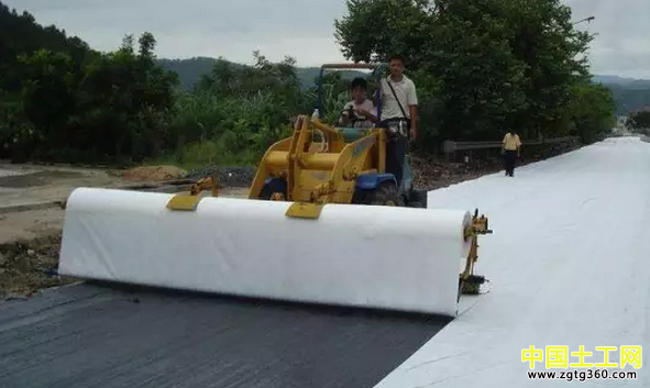可將瀝青浸漬土工布改成噴灑瀝青結(jié)合油,將土工布牢固地滾壓在上面,再噴一薄層瀝青增加對面層的粘合度,提高防水性。若使用攤鋪機鋪設(shè)瀝青混凝土面層時,可不噴面層瀝青,只在底面加大瀝青用量,控制在1000g/m2左右。經(jīng)碾壓后,瀝青會通過其孔隙透過土工布,反滲到面層。形成一道密封的防水層,同時還起到加筋作用。